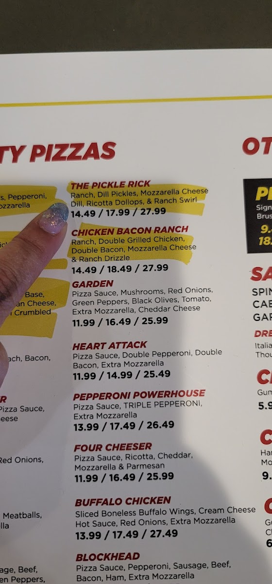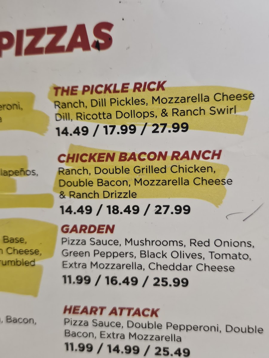 Regular Crust, Ranch, Deli Pickles, Mozzarella, Dill Sprinkle, Ricotta Dollops, and Ranch Drizzle