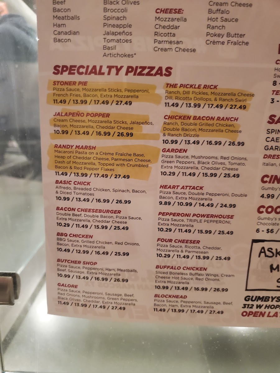 Regular Crust, Marinara, Mozzarella Sticks, French Fries, Pepperoni, Bacon, and Extra Mozzarella